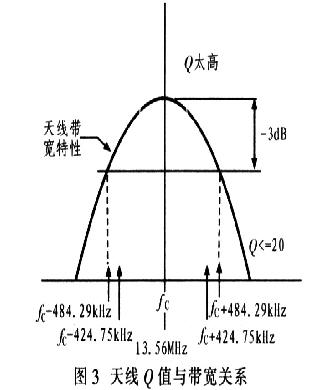由式(2)可看出,天線的傳輸帶寬B與品質(zhì)因數(shù)Q成反比。因此,過高的品質(zhì)因數(shù)將導(dǎo)致帶寬縮小,降低讀寫器的調(diào)制邊帶信號(hào)幅度,導(dǎo)致讀寫器無法與標(biāo)簽通信。天線Q值與3 dB帶寬的關(guān)系曲線如圖3所示。由圖3可看出:環(huán)形天線與50 Ω的負(fù)載相連時(shí),其Q值最好不超過30。為了優(yōu)化天線的性能。讀寫器匹配電路的駐波比應(yīng)小于1:1.2。