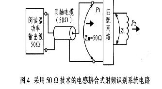 本文研究的RFID讀寫器頻率為13.56 MHz,為有效抑制功率反射、寄生輻射等高頻效應(yīng),通常是將讀寫器天線通過同軸電纜連接到讀寫器的高頻模塊,同軸電纜阻抗為50 Ω。因此,天線的阻抗匹配就是通過一定的無源匹配電路來改變讀寫器天線的輸入阻抗,使其與同軸電纜的阻抗保持一致,這樣就可使能量通過同軸電纜幾乎無損失的從讀寫器傳送出去。圖4為采用50 Ω技術(shù)的電感耦合式射頻識(shí)別系統(tǒng)電路。