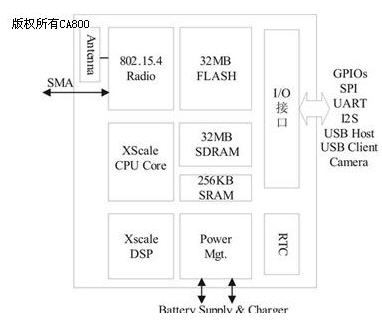 在設(shè)計(jì)無(wú)線傳感器網(wǎng)絡(luò)網(wǎng)關(guān)時(shí),需要較強(qiáng)的數(shù)據(jù)處理能力,用以實(shí)現(xiàn)復(fù)雜路由協(xié)議以及信息處理等。如圖5所示Crossbow的imote2節(jié)點(diǎn)采用了MarvellPXA271高性能、低功耗處理器。該處理器使用動(dòng)態(tài)電壓調(diào)節(jié)技術(shù),頻率范圍13MHz~416MHz,可工作于低電壓(0.85V)低頻率(13MHz)模式,具備了優(yōu)良的動(dòng)態(tài)電源管理技術(shù)。此外,該處理器封裝內(nèi)集成三個(gè)芯片256KBSRAM,32MBFLASH以及32MBSDRAM,減小了體積。通過(guò)提供多種I/O,能夠靈活的支持不同種類的傳感器。該處理器還支持一個(gè)MMX協(xié)處理器,提高多媒體處理能力,可以用于無(wú)線多媒體傳感器網(wǎng)絡(luò)中的語(yǔ)音和圖像處理。Imote2使用TI的CC2420ZigBee射頻芯片,支持2.4GHz、16通道250kb/s數(shù)據(jù)傳輸,發(fā)送功率-24~0dBm。有效通訊距離是30米,可以通過(guò)SMA接口外接天線來(lái)增加傳輸距離。