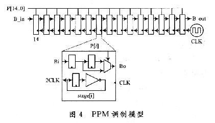 PPM調(diào)制可以采用計數(shù)器結(jié)構(gòu)產(chǎn)生,但是這種結(jié)構(gòu)耗能大,所用分頻器結(jié)構(gòu)如圖4所示。