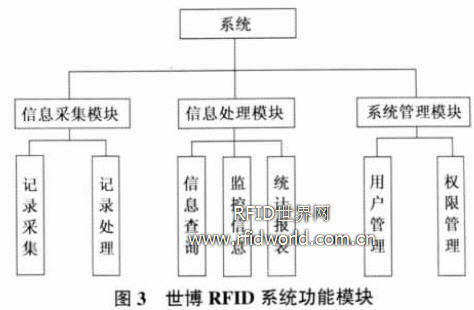 根據(jù)世博會對RFID 自動識別系統(tǒng)的應用需求以及RFID 技術(shù)本身的特性, 我們設想的系統(tǒng)功能模塊包括信息采集模塊、信息處理模塊、系統(tǒng)管理模塊、統(tǒng)計報表模塊和接口模塊(見圖3)。
