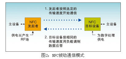 支持NFC的設(shè)備可以在主動或被動模式下交換數(shù)據(jù)。在被動模式下,啟動NFC通信的設(shè)備,也稱為NFC發(fā)起設(shè)備(主設(shè)備),在整個(gè)通信過程中提供射頻場(RF-field),如圖2所示。它可以選擇106kbps、212kbps或424kbps其中一種傳輸速度,將數(shù)據(jù)發(fā)送到另一臺設(shè)備。另一臺設(shè)備稱為NFC目標(biāo)設(shè)備(從設(shè)備),不必產(chǎn)生射頻場,而使用負(fù)載調(diào)制(load modulation)技術(shù),即可以相同的速度將數(shù)據(jù)傳回發(fā)起設(shè)備。此通信機(jī)制與基于ISO14443A、MIFARE和FeliCa的非接觸式智能卡兼容,因此,NFC發(fā)起設(shè)備在被動模式下,可以用相同的連接和初始化過程檢測非接觸式智能卡或NFC目標(biāo)設(shè)備,并與之建立聯(lián)系。