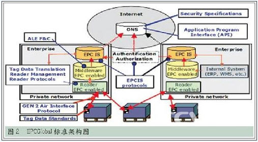 EPCglobal提出了Auto-ID系統(tǒng)的五大技術(shù)組成,分別是EPC(電子產(chǎn)品碼)標(biāo)簽、RFID標(biāo)簽閱讀器、ALE中間件實(shí)現(xiàn)信息的過濾和采集、EPCIS信息服務(wù)系統(tǒng),以及信息發(fā)現(xiàn)服務(wù)(包括ONS和PML)。由于從一開始就讓世界各大洲的從業(yè)人員充分參與,EPCGlobal標(biāo)準(zhǔn)(架構(gòu)圖如下)得到了較廣泛認(rèn)同,這里不再對(duì)其標(biāo)準(zhǔn)體系架構(gòu)贅述。