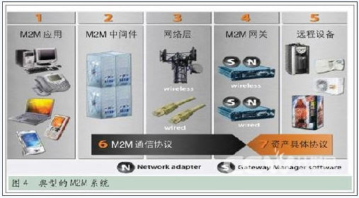 業(yè)界認(rèn)同的M2M理念和技術(shù)架構(gòu)覆蓋的范圍應(yīng)該是最廣泛的,包含了EPCGlobal和WSN的部分內(nèi)容,也覆蓋了有線和無線兩種通信方式,一個(gè)典型的M2M系統(tǒng)由圖4所示的幾個(gè)部分組成。