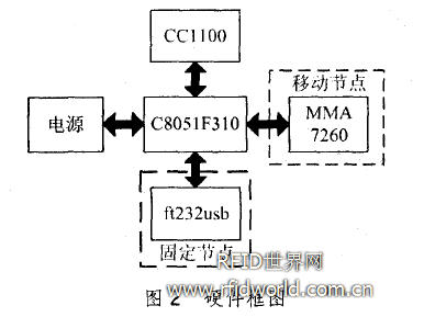 節(jié)點的硬件框圖如圖2。其中控制芯片和射頻芯片分別選用Silicon C8051 F31 0 和ChipconCCI 1 O0。其中RFID 移動節(jié)點安裝了FreescaleMMA726O加速度傳感器,用來獲取貨車(或集裝箱)當(dāng)前的運動狀態(tài)。移動節(jié)點還利用MCU 內(nèi)部1 6KB大小的Flash儲存貨物信息。同時,RFID固定節(jié)點安裝了FT232串口轉(zhuǎn)USB芯片,用于和控制臺通過USB接口通訊。電源方面,移動節(jié)點采用11 00mA手機電池供電,固定節(jié)點采用外接電源供電。