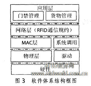有了底層軟件結(jié)構(gòu)的支持,在最上層的軟件體系結(jié)構(gòu)對應(yīng)的是OSI模型中應(yīng)用層和網(wǎng)絡(luò)層的功能,實現(xiàn)了門禁管理、貨物管理等功能。這一層分為上下兩層,下層對應(yīng)網(wǎng)絡(luò)層的職能,為RFID 讀卡器和標(biāo)簽之間的通信設(shè)計了一套帶低功耗算法的通信規(guī)約(見4。2節(jié))。基于網(wǎng)絡(luò)層的通信規(guī)約,門禁和貨物管理這兩大功能才能在應(yīng)用層進行實現(xiàn)。