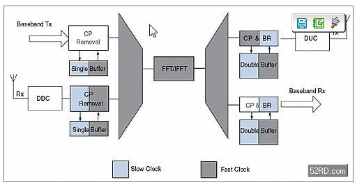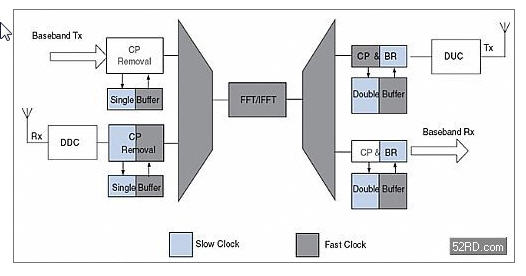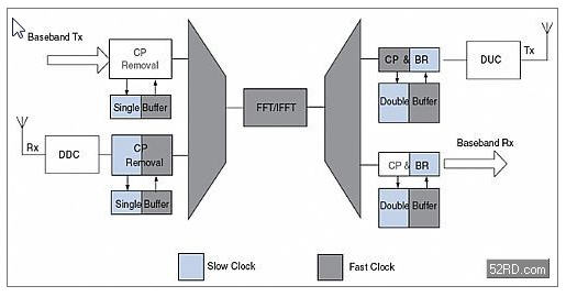 圖5描述的是FDD系統(tǒng)下FFT復用的一種可能配置。數(shù)據(jù)發(fā)送和接收通道的操作類似于TDD系統(tǒng),其區(qū)別在于這些操作是同時進行的。因此,pre-FFT數(shù)據(jù)必須被緩存且把頻率提高到快時鐘頻率。用一個單緩沖器就足以改變速率,因為緩沖器的寫時鐘頻率總是低于或等于讀時鐘頻率。