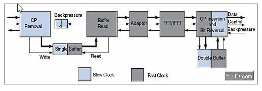 如前面所討論,如果FFT為了資源共享采用不同速率的時鐘,則需要pre-FFT數(shù)據(jù)緩沖器。在接收通道上,每當輸入數(shù)據(jù)開始寫入單緩沖器時,循環(huán)前綴移除模塊開始記數(shù)。當整個數(shù)據(jù)包都被寫入這個單緩沖器時,記數(shù)值開始從0地址被讀出。
