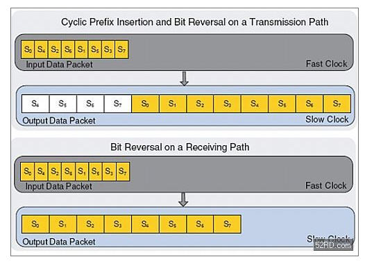 FFT的MegaCore函數(shù)被設定為可變流模式,它允許FFT的大小和方向逐包改變。它還采用了存儲效率模式——這是FFT核的唯一模式,直接從FFT的蝶形引擎中輸出位反轉(zhuǎn)符號。可以在FFT核之外結(jié)合帶有循環(huán)前綴插入的位反轉(zhuǎn)。這樣,整個OFDM調(diào)制可以節(jié)省出一個單緩沖器。