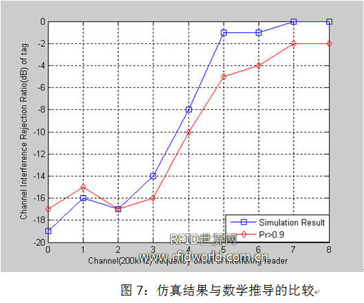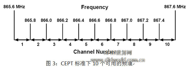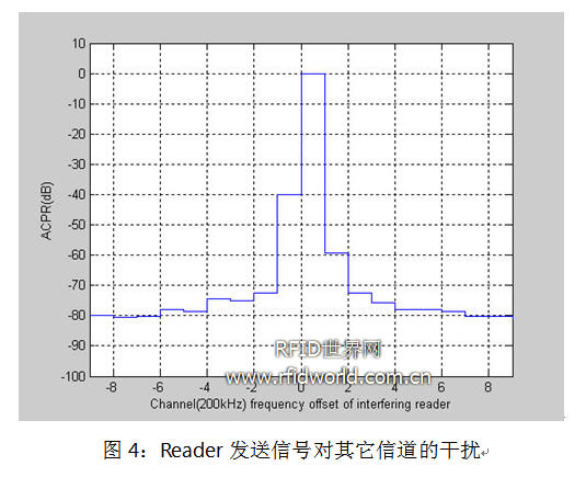 Reader可以工作在多個(gè)信道上,圖3是CEPT標(biāo)準(zhǔn)下10個(gè)可用的信道。圖4是工作在某個(gè)信道上的reader對(duì)相鄰信道和其它的干擾情況。由此,我們可以得出,通過(guò)信道劃分可以使多個(gè)reader同時(shí)正常工作。所以,Signal-to-Interference Ratio(SIR)的門限值不會(huì)產(chǎn)生Reader-to-Tag干擾或Reader-to-Reader干擾成為我們研究的重點(diǎn)。