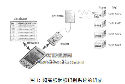 射頻識(shí)別(RFID)技術(shù)是一種自動(dòng)識(shí)別技術(shù),己經(jīng)有幾十年的歷史了,并被廣泛應(yīng)用于動(dòng)物識(shí)別、鐵路車皮識(shí)別、自動(dòng)高速公路收費(fèi)、航空行李處理、資產(chǎn)跟蹤、公共交通等[1]。MIT的Auto-ID中心提出了產(chǎn)品電子編碼(EPC)的概念[2],把類似于條形碼編碼的產(chǎn)品電子編碼(EPC)存儲(chǔ)在電子標(biāo)簽(Tag, or Transponder)中,電子標(biāo)簽貼在物體上,閱讀器(Reader, or Interrogator)通過(guò)電磁波從讀出編碼,通過(guò)這種方式可以識(shí)別物體。圖1是超高頻射頻識(shí)別系統(tǒng)的組成,電子標(biāo)簽貼在物品表面,閱讀器和標(biāo)簽之間通過(guò)電磁波進(jìn)行通信,閱讀器獲取的EPC編碼傳輸?shù)街鳈C(jī)中,從而識(shí)別物品。當(dāng)電子標(biāo)簽的成本很低時(shí),可以取代條形碼。