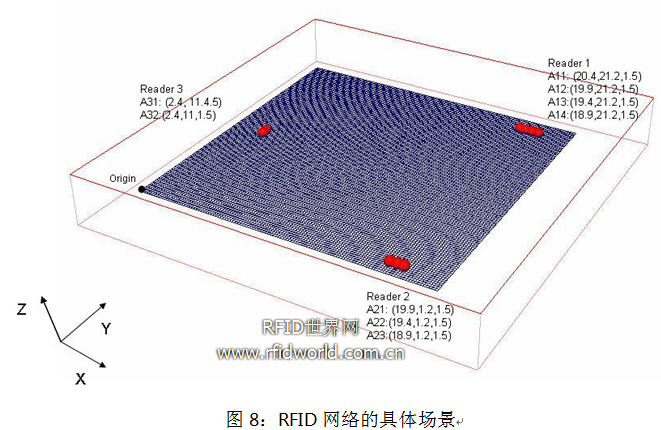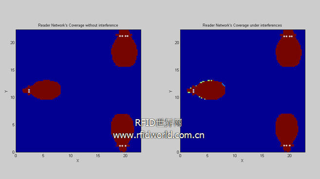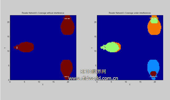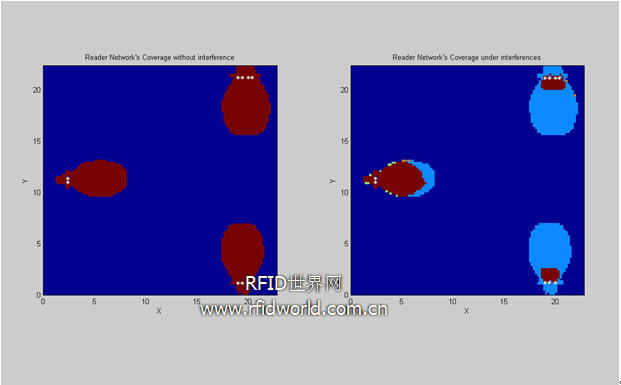 圖9是當(dāng)3個(gè)reader工作在發(fā)射功率為2W,信道相同的情況下得到的區(qū)域分布圖。