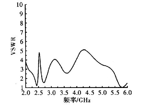 天線駐波的仿真結(jié)果,如圖2所示。天線諧振于2.4 GHz和5.8 GHz,實現(xiàn)雙頻工作。低端頻段(駐波<2)為2.35~2.47 GHz,帶寬約有120 MHz,覆蓋了IEEE802.1lb/g的工作頻段;高端頻段為5.56~6.07 GHz,帶寬約為510 MHz,覆蓋了IEEE802.11 a的工作頻段。