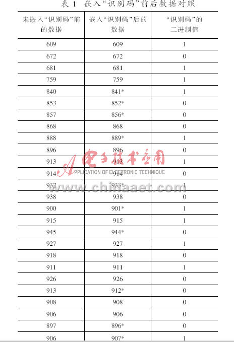 嵌入“識(shí)別碼”前后數(shù)據(jù)對(duì)照如表1所示。表中左列為未嵌入“識(shí)別碼”時(shí)的“光照”數(shù)據(jù),中間列為嵌入“識(shí)別碼”后的“光照”數(shù)據(jù),右列是“識(shí)別碼”的二進(jìn)制形式。中間列標(biāo)有*的數(shù)字為嵌入“識(shí)別碼”后發(fā)生變化的數(shù)據(jù)。
