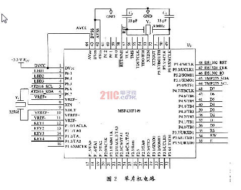 本系統(tǒng)的控制電路采用MSP430F149單片機(jī),MSP430F149共有五種低功耗模式,即低功耗模式O(LPMO)至低功耗模式4(LPM4),非常適合手持設(shè)備的低功耗要求,具體電路如圖2所示。由圖2可看出,單片機(jī)的P1.O,P1.1,P1.2,P1.3作為通用I/O口接鍵盤,P4口和P3.5,P3.6,P3.7分別作為LCD液晶顯示器的數(shù)據(jù)與控制連接端口;單片機(jī)的P5.1,P5.2接TMS275溫度傳感器芯片,P5.2,P5.3,P5.4接DSl302芯片引腳,P6.6和P6.7接AT24C16芯片引腳,三個芯片都使用軟件模擬I2C總線協(xié)議,P6.3和P6.4接LED起指示作用。