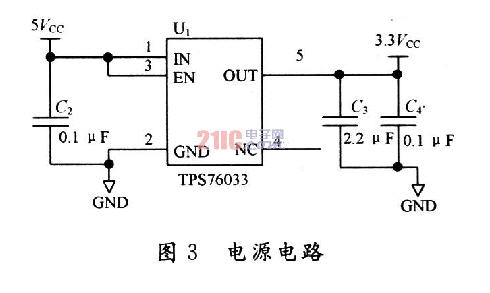 由于MSP430系列單片機(jī)的工作電壓一般是l.8~3.6 V,并且功耗極低,因此選用TI公司的TPS70633作為電源芯片。該電源芯片輸出為3.3 V,電流為50 mA,完全能滿足大多數(shù)低功耗應(yīng)用場合的要求。圖3為具體電路,由圖3可以看出:該電路非常的簡單,只需要簡單的外圍器件。為了使輸出電源的紋波小,在輸出部分用了一個2.2μF和0.1μF的電容,另外在芯片的輸入端也放置一個2.2μF的濾波電容,進(jìn)一步減小干擾。