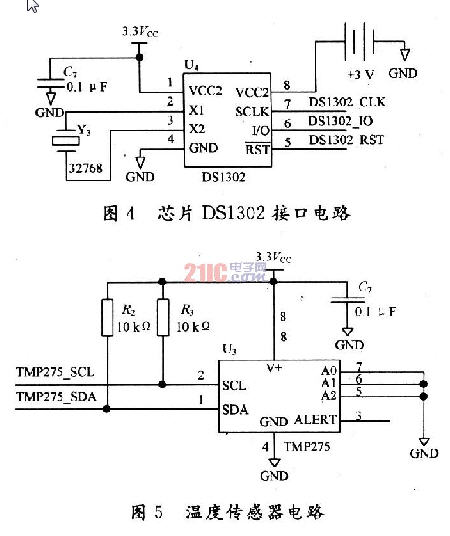 系統(tǒng)采用的溫度傳感器為TI公司的TMP275,圖5為溫度傳感器電路,該器件的主要特性包括:50μA功耗、9~12 b可編程分辨率、O.1μA關(guān)機(jī)電流模式、整個溫度范圍內(nèi)出色的穩(wěn)定性以及-40~+125℃的廣泛工作溫度范圍。該器件還允許多達(dá)8個不同地址,以實現(xiàn)接口總線設(shè)計的高靈活性,電路中.AO,A1,A2接地用于決定芯片的器件地址。溫度傳感器TMP275可直接輸出數(shù)字信號,而無需對采樣信號作信號調(diào)理和信號的模數(shù)轉(zhuǎn)換,可以直接傳輸給單片機(jī)信號處理系統(tǒng),測溫精度±0.5℃。TMP275兩線串行接口(引腳SDL,SDA)與I2C總線接口兼容,可直接與其相連。