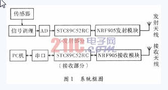 文中利用51單片機(jī)和無線數(shù)據(jù)收發(fā)芯片nRF905構(gòu)成無線數(shù)據(jù)傳輸系統(tǒng),給出了硬件和軟件設(shè)計方案。其數(shù)據(jù)傳輸過程是:從傳感器輸入的模擬信號經(jīng)AD采集后,將數(shù)據(jù)輸入單片機(jī),然后單片機(jī)將該發(fā)送數(shù)據(jù),通過SPI接口發(fā)送給nRF905,nRF905將數(shù)據(jù)自動加上前導(dǎo)碼和CRC碼后將數(shù)據(jù)包發(fā)送。當(dāng)接收端的nRF905接收到有效數(shù)據(jù)后,DR置高;單片機(jī)檢測到DR為高電平后,復(fù)位TRX_CE引腳,使nRF905進(jìn)入空閑模式,通過SPI接口從nRF905中讀出接收數(shù)據(jù),然后通過串口在上位機(jī)顯示。文中主要介紹的是51單片機(jī)軟件模擬SPI和無線數(shù)據(jù)收發(fā)這兩個部分。圖1是該系統(tǒng)的總體結(jié)構(gòu)框圖。