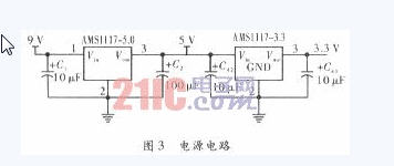 本系統(tǒng)使用兩個電源,單片機(jī)STC89C52RC使用5V電源,NRF905采用3.3V電源進(jìn)行供電,然后把STC89C52RC和NRF905共地,否則會出現(xiàn)無法傳輸數(shù)據(jù)。其中轉(zhuǎn)換芯片分別使用AMSlll7-5.0轉(zhuǎn)5V芯片和AMSl117-3.3轉(zhuǎn)3.3 V芯片電路圖,如圖3所示。電源電路使用220 V的交流電適配器輸出的9 V直流,經(jīng)C1濾波進(jìn)入AMSlll7-5.0,然后在輸出端接一個100μF的電容進(jìn)行濾波去耦,從而得到5 V直流電壓供單片機(jī)使用;然后5 V電壓接入下一級AMSlll7-3.3電源轉(zhuǎn)換芯片,輸出3.3 V供NRF905使用。