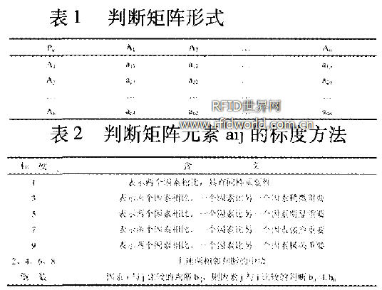 任何系統(tǒng)分析都以一定的信息為基礎(chǔ),層次分析法的信息基礎(chǔ)主要是人們對(duì)于每一層次中各因素相對(duì)重要性的判斷。這些判斷通過引入合適的標(biāo)度,用數(shù)值表示出來,形成判斷短陣。判斷矩陣表示針對(duì)上一層次某個(gè)元素,本層次與其有關(guān)因素的相對(duì)重要性的比較。若A層次的上一層次P的因素P 與A層次中的A1,A2,...,An有聯(lián)系,則判斷矩陣形式如表2表示。判斷矩陣的元素aij用薩蒂的1—9標(biāo)度方法給出(如表1所示)。