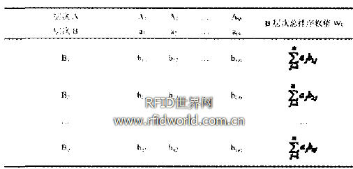 計(jì)算同一層次所有因素對(duì)于最高層(總目標(biāo))相對(duì)重要性的權(quán)值,稱為層次總排序。這一過程是最高層次到最低層次進(jìn)行的。若上一層次A包含m個(gè)因素A1,A2,......,Am,下一層次B包含B1,B2,......,Bn ,它們對(duì)于因素A 的層次單排序權(quán)值分別為b1j,b2j,......,b nj,(當(dāng)Bk與Aj無聯(lián)系時(shí),bkj=0),則B層次總排序權(quán)值由表4給出。