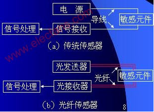 以電為基礎(chǔ)的傳統(tǒng)傳感器是一種把測量的狀態(tài)轉(zhuǎn)變?yōu)榭蓽y的電信號的裝置。它的電源、敏感元件、信號接收和處理系統(tǒng)以及信息傳輸均用金屬導(dǎo)線連接,見圖(a)。光纖傳感器則是一種把被測量的狀態(tài)轉(zhuǎn)變?yōu)榭蓽y的光信號的裝置。由光發(fā)送器、敏感元件(光纖或非光纖的)、光接收器、信號處理系統(tǒng)以及光纖構(gòu)成,見圖(b)。