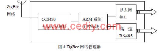 在該系統(tǒng)中的ZigBee網(wǎng)絡(luò)管理器集成了 ZigBee網(wǎng)絡(luò)中的網(wǎng)關(guān)和協(xié)調(diào)器的功能,具備至關(guān)重要的作用,一方面采用 ZigBee無線網(wǎng)絡(luò)方式與無線溫度傳感器節(jié)點連接,并且以固定的時間間隔對無線溫度傳感器節(jié)點進行測溫以及讀取它的工作參數(shù),同時存入內(nèi)存,這就需要每個終端為所管理的無線溫度傳感器節(jié)點設(shè)置編號表,以免發(fā)生錯亂;另一方面采用或以太網(wǎng)(或RS-485總線)與測溫主機連接,受控于測溫主機的命令而做出一系列的反映。具體功能有:接收并存儲傳感器數(shù)據(jù);管理所管轄的 ZigBee子網(wǎng);報警功能;傳輸數(shù)據(jù)給測溫主機;設(shè)定和修改終端工作參數(shù);工作狀態(tài)指示;時鐘和看門狗功能。結(jié)構(gòu)如圖4所示: