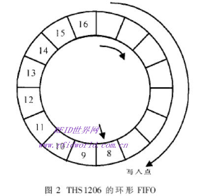 THS1206內(nèi)部的FIFO安排成環(huán)形,采用讀取點(diǎn)、寫入點(diǎn)和觸發(fā)點(diǎn)控制讀寫操作,如圖2所示。芯片的轉(zhuǎn)換時(shí)鐘CONV_CLK控制采樣保持和A/D變換,CONV_CLK讓四個(gè)通道的信號(hào)同時(shí)采樣保持,然后分別轉(zhuǎn)換為數(shù)字信號(hào)并自動(dòng)順序?qū)懭隖IFO,同時(shí)FIFO的寫入點(diǎn)向前移動(dòng),指示下一個(gè)寫入點(diǎn);當(dāng)FIFO內(nèi)的數(shù)據(jù)達(dá)到預(yù)定的觸發(fā)深度時(shí),發(fā)出數(shù)據(jù)就緒信號(hào)DATSA_AV發(fā)出,DSP讀取轉(zhuǎn)換數(shù)據(jù),同時(shí)清除DATA_AV信號(hào),讀取點(diǎn)和觸發(fā)點(diǎn)向前移動(dòng)。芯片的工作方式由兩個(gè)寄存器控制,通過寫寄存器,可以選擇使用通道、工作模式、FIFO觸發(fā)深度、DATA_AV的極性與觸發(fā)方式等。