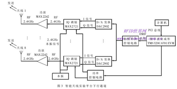 圖3給出智能天線實(shí)驗(yàn)平臺(tái)下行通道的框圖。待發(fā)送數(shù)據(jù)由計(jì)算機(jī)通過PCI總線傳給C6701EVM評(píng)估板,C6701DSP根據(jù)波束成形的需要生成各通道所需的數(shù)字基帶I/Q信號(hào);D/A變換器DAC2902把數(shù)字基帶I/Q信號(hào)變成模擬I/Q信號(hào),為了保持各通道信號(hào)的相位關(guān)系,各路D/A變換器采用統(tǒng)一的時(shí)鐘啟動(dòng)D/A變換,各路D/A變換器的控制信號(hào)由D/A變換控制電路產(chǎn)生;各通道模擬I/Q信號(hào)由零中頻I/Q調(diào)制器MAX2721上變頻到2.4GHz的射頻信號(hào),經(jīng)過功率放大器MAX2242放大后送到天線陣列輻射,形成下行波束;各通道I/Q調(diào)制器所需的本振信號(hào)由統(tǒng)一的信號(hào)源產(chǎn)生以保證各通道的相位關(guān)系;C6701EVM通過McBSP發(fā)送命令到功率控制電路產(chǎn)生控制信號(hào)到MAX2721的功率控制端,控制天線陣列的輸出功率。