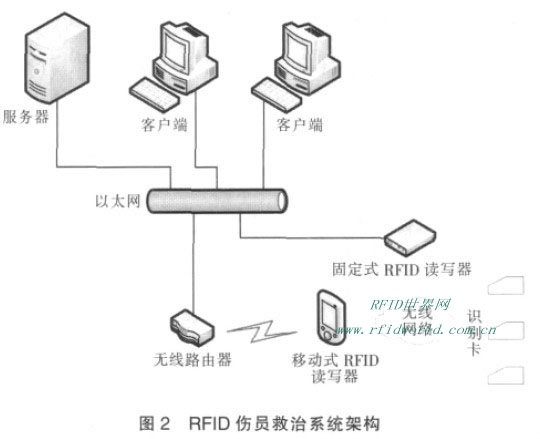 取左胸前,也可以作為一個功能模塊嵌于其他隨身攜帶的裝備中。如圖2 所示,傷員救治系統(tǒng)由5 部分組成,包括服務器(server)、客戶端(client)、移動式RFID 讀寫器、固定式RFID 讀寫器和單兵RFID 識別卡。系統(tǒng)采用B/S 模式。