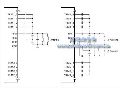 為了落實(shí)LC諧振天線的校準(zhǔn)二進(jìn)制加權(quán)微調(diào)電容器要兩個(gè)線圈之間的連接終端TRIM1_3的TRIM1_0和TRIM2_3的TRIM2_0。如果單一驅(qū)動(dòng)程序僅用于天線端口TRIM1_3的TRIM1_0使用,圖2為單端與差分電容連接示意圖。