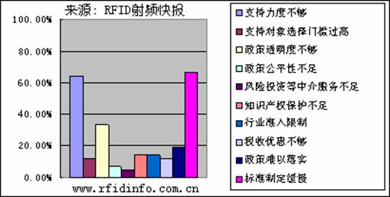 在我國(guó)RFID產(chǎn)業(yè)政策方面,2/3的調(diào)研對(duì)象認(rèn)為標(biāo)準(zhǔn)制定緩慢是國(guó)家在支持企業(yè)RFID產(chǎn)業(yè)化發(fā)展的主要問題,接近2/3的調(diào)研對(duì)象認(rèn)為國(guó)家對(duì)RFID產(chǎn)業(yè)化的支持力度不夠,有1/3的調(diào)研對(duì)象認(rèn)為政策透明度不夠,還有部分調(diào)研對(duì)象認(rèn)為政府在知識(shí)產(chǎn)權(quán)保護(hù)方面的力度不夠。