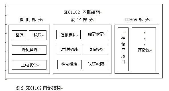 SHC1102是上海華虹集成電路有限公司的非接觸式IC卡芯片系列產(chǎn)品之一,其內(nèi)部結(jié)構(gòu)主要由射頻接口電路、電源電路、邏輯控制電路、EEPROM存貯單元電路四個(gè)部分組成,如圖2所示。