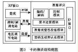 圖3為卡的模塊結構框圖。整流穩壓模塊主要是接收閱讀器發來的載波,將載波信號轉變成直流信號,以作為非接觸IC卡內部芯片的電源使用;同時不能因為閱讀器發來的不間斷載波而使芯片內部電源電壓無限增大。調制解調模塊主要是將閱讀器發來的信號從載波信號中取下來;在IC卡發送信號時將內部的數字信號轉換成模擬信號,并上載到載波信號中以傳輸給閱讀器。