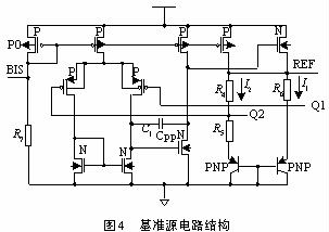 該模塊主要包括基準源電路、電壓調節電路和電源開關電路。基準源電路由二級CMOS差分放大電路和晶體管電路構成的能隙基準源組成。其結構如圖4。