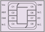 智能卡是IC卡中最高級(jí)的一種,其內(nèi)部一般有CPU、ROM、RAM和EEPROM等資源,卡內(nèi)一般都駐有智能卡操作系統(tǒng)(COS),該操作系統(tǒng)對(duì)卡進(jìn)行維護(hù)和管理并解釋終端的各種命令。由于卡內(nèi)有CPU和RAM,所以可以根據(jù)需要進(jìn)行一些運(yùn)算和數(shù)據(jù)加密,同時(shí)卡內(nèi)的EEPROM也可以存放一些用戶資料(容量也較存儲(chǔ)卡大)。智能卡的管腳如圖4所示。