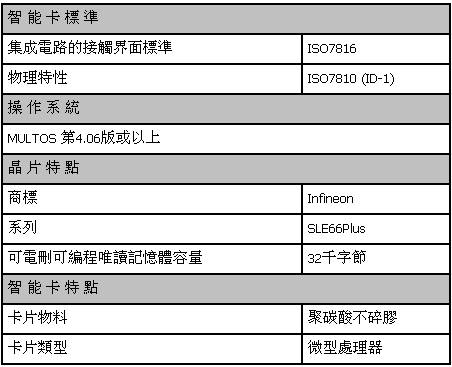 下表列出智能身份證的一般規格,以備參考:
