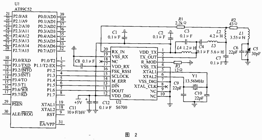 所設計的應用電路如圖2所示。圖2中包括三個部分:ASIC典型應用電路、與MCU接口電路和天線電路。R2、L1、C5、C6組成串聯諧振電路,匹配阻抗50Ω,可調電容C6用來準確調整電路諧振點在13.56MHz。如果認為ASIC 200mW輸出功率不足,也可以再加一級功放電路,以提高讀寫距離。