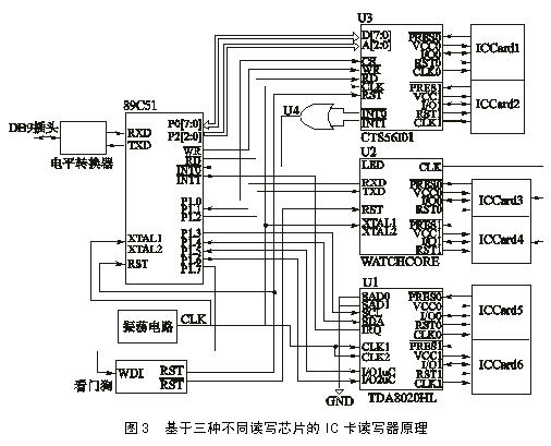 IFD內(nèi)的IC卡讀寫芯片,按其與IFD內(nèi)的CPU的通信方式進(jìn)行分類,有并行通信、半雙工串行通信和I2C通信的讀寫芯片。圖3是一個(gè)基于三種不同通信方式讀寫芯片的通用IC卡讀寫器的原理示意。這個(gè)系統(tǒng)可以同時(shí)對(duì)6片IC卡進(jìn)行操作,其中每一個(gè)IC卡讀寫芯片都可以驅(qū)動(dòng)2片IC卡。應(yīng)用系統(tǒng)可以根據(jù)實(shí)際情況合理選用其中的一種或多種讀寫芯片。