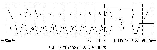 圖4為向TDA8020寫入命令的格式。按圖3所示,對(duì)卡1的地址和寫的字節(jié)為40H。