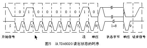 從TDA8020讀出狀態(tài)的格式如圖5所示。按圖3所示,對(duì)卡1的地址和讀的字節(jié)為41H。