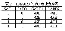 TDA8020與IFD內(nèi)CPU的通信是用I2C總線方式進(jìn)行的。通過(guò)I2C接口,IFD內(nèi)的CPU可以向TDA8020發(fā)送命令或讀取TDA8020的狀態(tài)。TDA8020有兩個(gè)地址選擇引腳(SAD0和SAD1)。在圖3中,這兩個(gè)地址選擇引腳接地,對(duì)應(yīng)兩個(gè)IC卡的I2C總線地址分別是40H和48H。如果系統(tǒng)中有別的I2C總線器件,可以按表2的方式進(jìn)行尋址。