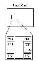 X76F100為128×8位的保密串行FLASH E2PROM,其中讀密碼和寫密碼分別為64位。圖2為其智能卡Smart Card封裝的引腳圖。把芯片封裝在一個(gè)卡片上,將卡片插入IC卡讀寫器的卡座中,讀寫器就可以對它進(jìn)行讀寫,實(shí)現(xiàn)加密、查詢、存款、取款等功能。