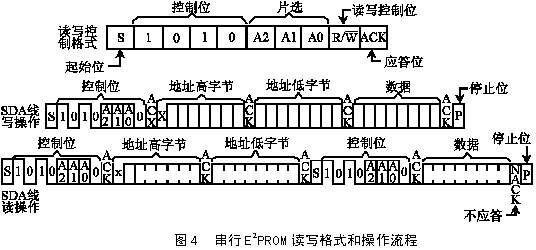 24C64為I2C總線的E2PROM。SCL為400kHz時鐘線,SDA為雙向數(shù)據(jù)線,A2、A1、A0三位為片選地址,即I2C總線上最多可并聯(lián)8個串行E2PROM芯片。對E2PROM的操作方式由讀寫控制命令字決定,如圖4所示。其中1010為4位讀寫控制碼,R/W為讀寫控制位:0為寫操作,1為讀操作。所以結(jié)合圖1可知A2H為寫控制命令字,A3H為讀控制命令字。
