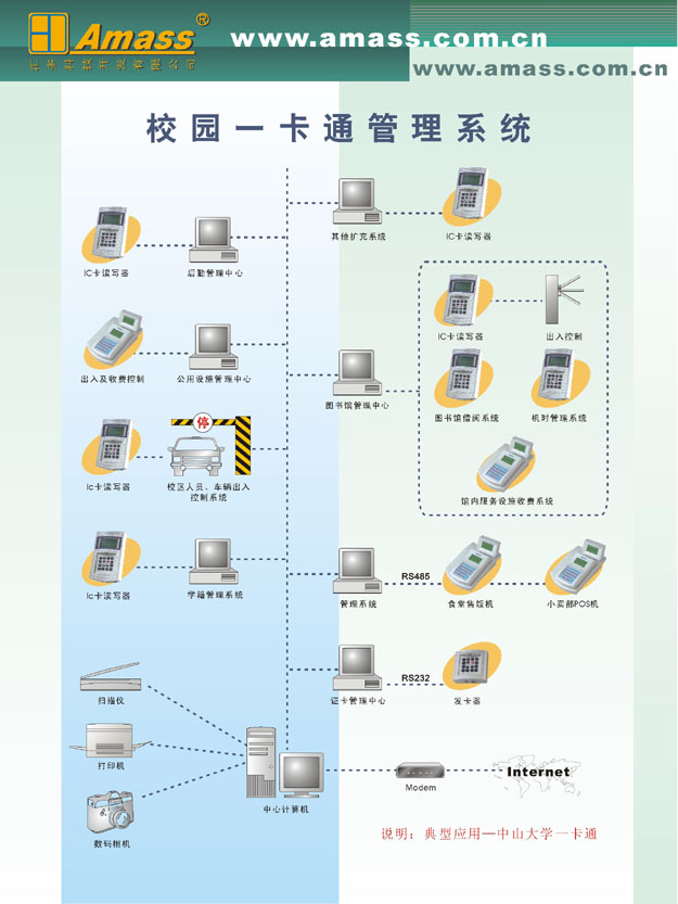 針對中山大學(xué)圖書館的應(yīng)用要求,本方案實(shí)現(xiàn)了圖書館大門門禁、閱覽室門禁、圖書借閱和上機(jī)機(jī)時管理等功能, 根據(jù)客戶需要系統(tǒng)可以方便地擴(kuò)展為校園一卡通系統(tǒng)。系統(tǒng)框圖見后,現(xiàn)將方案中各個模塊簡單介紹如下: